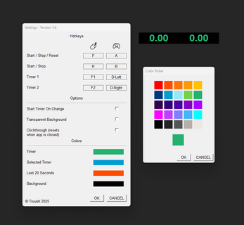 This program provides a customizable 2 timers window, meant to make keeping track of chase times in a set convenient while offering a user friendly and minimalistic design.